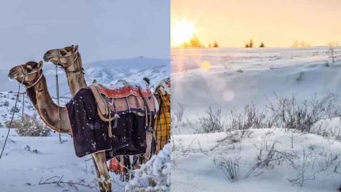 মরুভূমির এই শীতল রূপ দেখে বাঁধভাঙা উল্লাসে মেতেছেন স্থানীয় বাসিন্দারা। তুষারপাতের দুর্লভ মুহূর্তটি উপভোগ করতে ছোট-বড় সবাইকে গান গেয়ে এবং নেচে উদযাপন করতে দেখা গেছে। ভাইরাল হওয়া অন্য একটি ভিডিওতে দেখা যায়, সাদা বরফে ঢাকা প্রান্তরে দূর থেকে হেঁটে আসছে একদল উট—যা এক অভাবনীয় ও শৈল্পিক দৃশ্যের অবতারণা করেছে।