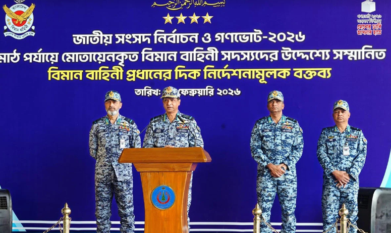 আসন্ন জাতীয় সংসদ নির্বাচন ও গণভোট-২০২৬ উপলক্ষ্যে মাঠ পর্যায়ে নিয়োজিত বিমান বাহিনী সদস্যদের উদ্দেশ্যে দিক নির্দেশনামূলক বক্তব্য প্রদান করেছেন বিমান বাহিনী প্রধান এয়ার চীফ মার্শাল হাসান মাহমুদ খাঁন। বৃহস্পতিবার ঢাকা