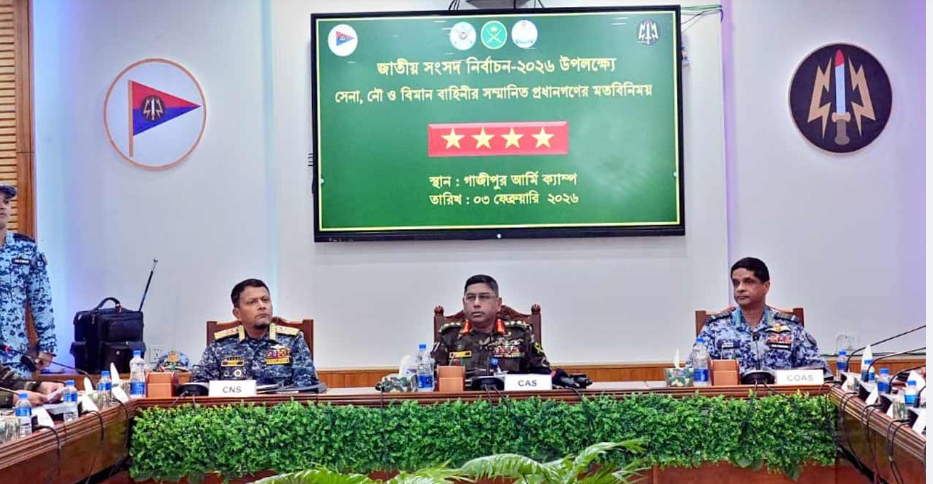 আসন্ন ত্রয়োদশ জাতীয় সংসদ নির্বাচন ও গণভোট-২০২৬ উপলক্ষ্যে সেনাবাহিনী প্রধান জেনারেল ওয়াকার-উজ-জামান, নৌবাহিনী প্রধান অ্যাডমিরাল এম নাজমুল হাসান এবং বিমানবাহিনী প্রধান এয়ার চিফ মার্শাল হাসান মাহমুদ খাঁন গাজীপুর জেলা পরিদর্শন