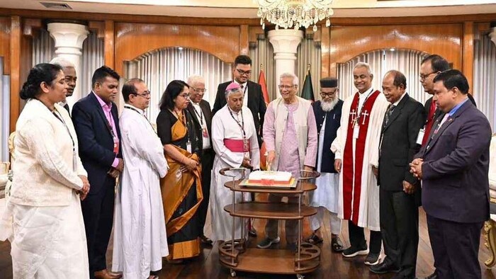 বড়দিন উপলক্ষে খ্রিস্টান সম্প্রদায়ের প্রতিনিধিদের সঙ্গে শুভেচ্ছা বিনিময় করেছেন প্রধান উপদেষ্টা প্রফেসর মুহাম্মদ ইউনূস। বুধবার (২৪ ডিসেম্বর) রাষ্ট্রীয় অতিথি ভবন যমুনায় খ্রিস্টান সম্প্রদায়ের প্রতিনিধিদের সঙ্গে শুভেচ্ছা বিনিময় করেন তিনি। ধর্ম