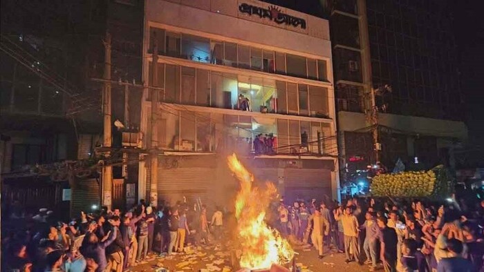 ইনকিলাব মঞ্চের মুখপাত্র শরিফ ওসমান হাদির মৃত্যুর পর শাহবাগে বিক্ষোভের মধ্যে দৈনিক প্রথম আলো পত্রিকার অফিসে হামলা-ভাঙচুর ও অগ্নিসংযোগ করেছে বিক্ষুদ্ধ জনতা। বৃহস্পতিবার (১৮ ডিসেম্বর) রাত ১২টার দিকে রাজধানীর কাওরানবাজারে