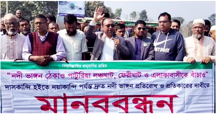 মানিকগঞ্জে পদ্মা ও যমুনা নদীর ভাঙন থেকে পাটুরিয়া এলাকাকে রক্ষার দাবিতে বিক্ষোভ মিছিল ও মানববন্ধন কর্মসূচি পালন করেছে এলাকাবাসী। বুধবার (২৮ জানুয়ারি) দুপুরে পাটুরিয়া ৫ নম্বর ফেরিঘাট থেকে বিক্ষোভ মিছিল